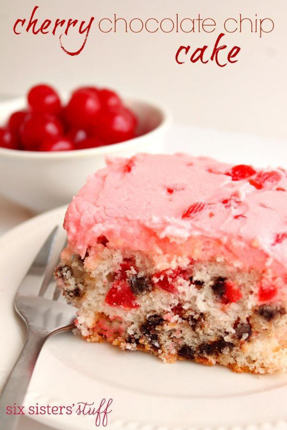 From the Six Sisters: "We had this cake for a family party and it was gone in minutes! We love the chunks of maraschino cherries mixed in with the mini chocolate chips!"