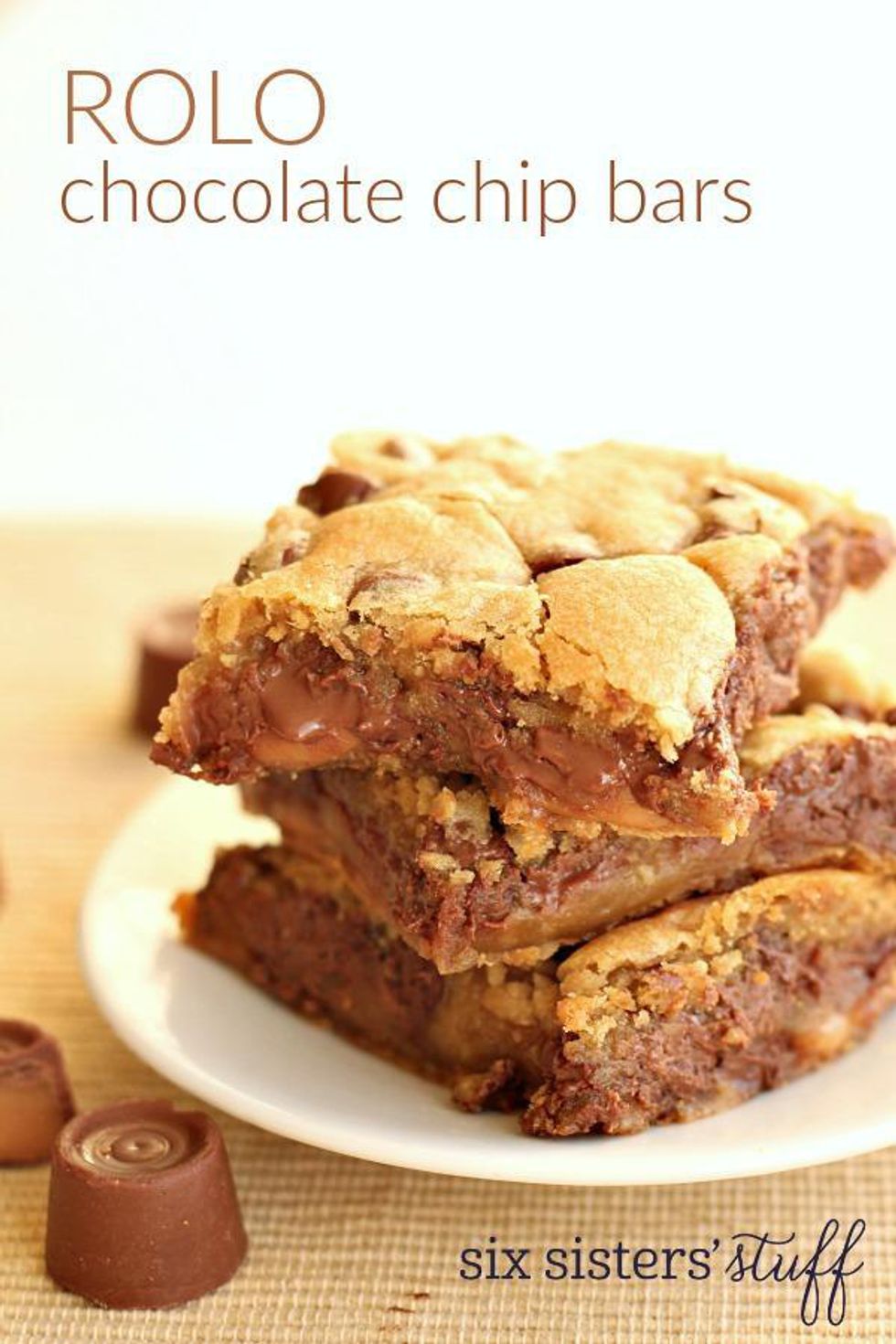 From the Six Sisters: "You'll go crazy of these gooey and chewy Rolo Chocolate Chip Bars! They are a spin off of our Caramel Chocolate Chip Cookie Bars, but this time we loaded them with Rolos!"