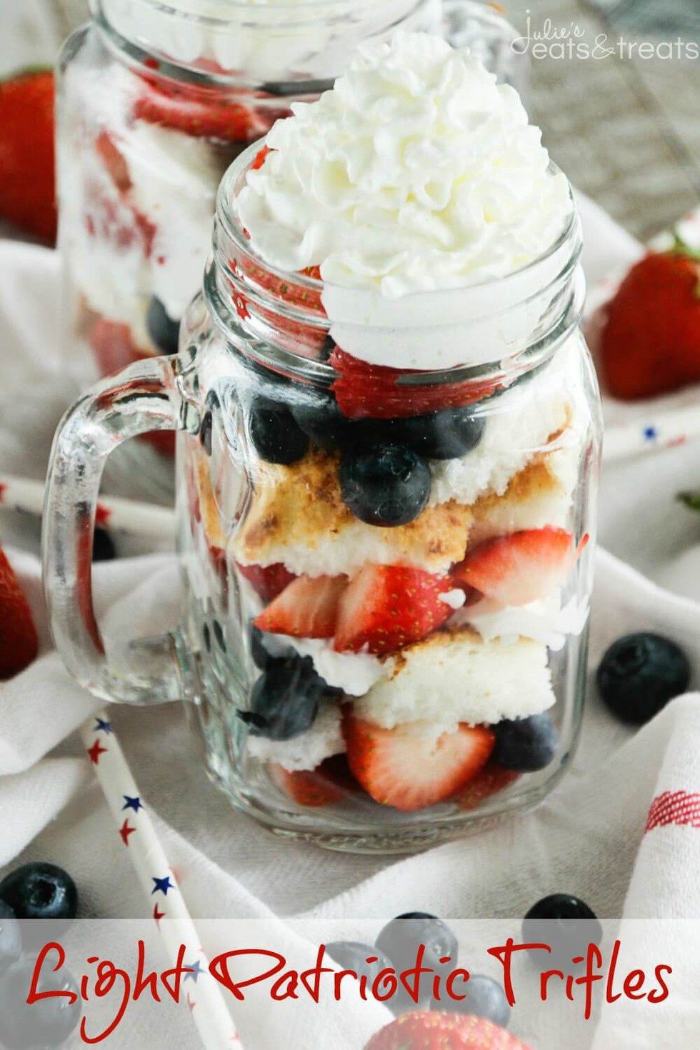 Delicious, Light Dessert Recipe to Feed Your Sweet Tooth! Layers of Angel Food Cake, Strawberries, Blueberries and Whipped Topping! See full recipe.