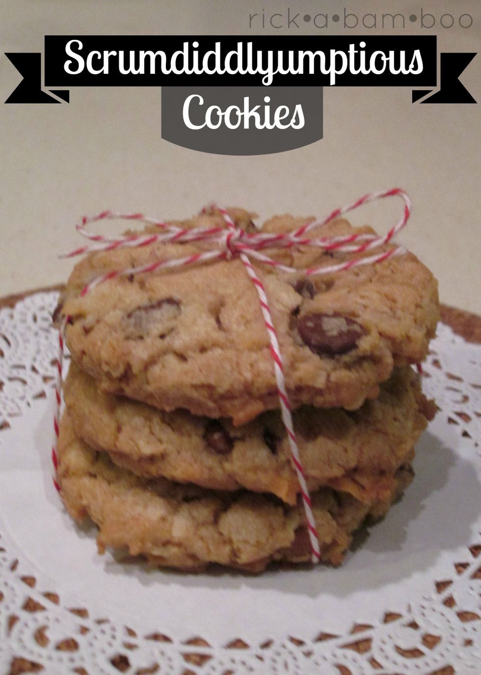These oatmeal cookies are loaded with chocolate chips, nuts, craisins, and coconut. Super soft and yummy. And that is why we call them Scrumdiddlyumptious. Recipe.