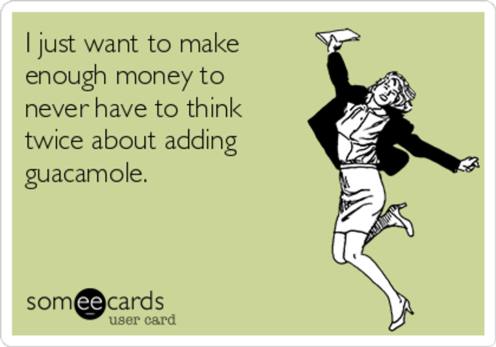 Your preferred appetizer, and a most delicious one at that. You're too invested in the relationship to say the entire word — it's guac to you, and will be forevermore. You want it on your salads, with chips, on your tacos, and more. You've spent hours making it on your own and you can tell the difference between that which was made with a mix and what was made from scratch.