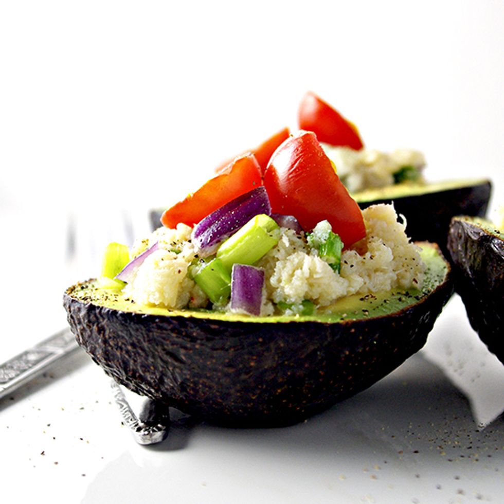 Seasoned crab, avocado, onion, and tomatoes come together for a paleo treat that is delightful enough to be an appetizer and filling enough to be a meal.
